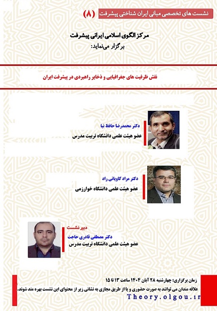 هشتمین نشست مبانی ایران شناختی با موضوع "نقش ظرفیت‌های جغرافیایی و ذخایر راهبردی در پیشرفت ایران"با سخنرانی آقایان دکتر محمدرضا حافظ‌نیا استاد دانشگاه تربیت مدرس و دکتر مراد کاویانی‌راد استاد دانشگاه خوارزمی برگزار خواهد شد، دبیر این نشست تخصصی را دکتر مصطفی قادری حاجت استاد دانشگاه تربیت مدرس و عضو اندیشکده آمایش بنیادین الگوی اسلامی ایرانی پیشرفت است. در این نشست‌ اساتید دانشگاه، کارشناسان و اعضای اندیشکده‌های الگوی اسلامی ایرانی پیشرفت همچنین علاقه‌مندان به این حوزه حضور خواهند داشت. این نشست در روز چهارشنبه 28 آبان ماه 1404 از ساعت 13:00 تا 15:00 در محل مرکز الگوی اسلامی ایرانی پیشرفت برگزار می‌‌شود و به صورت مجازی از طریق آدرس سامانه مجازی این نشست theory.olgou.ir در دسترس عموم قرار دارد.