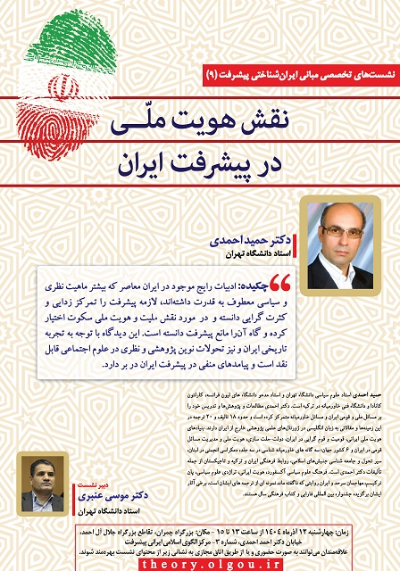 نهمین نشست مبانی ایران شناختی پیشرفت با موضوع «نقش هویت ملی در پیشرفت ایران» با سخنرانی دکتر حمید احمدی، استاد دانشگاه تهران در محل مرکز الگوی اسلامی ایرانی پیشرفت برگزار میشود. دبیر این نشست تخصصی دکتر موسی عنبری، استاد دانشگاه تهران است.